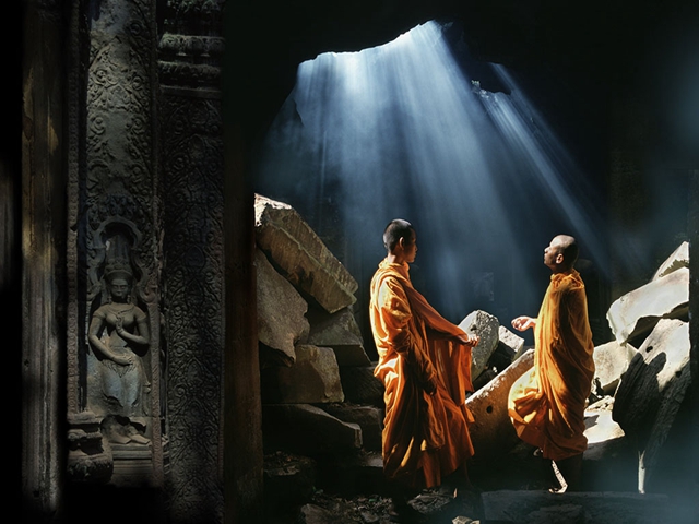 结实雄大的榙普伦寺,被当地人称为蛇树的卡波克(Kapok)树所盘踞,它们粗壮发亮的根茎,绕过梁柱、探入石缝、盘绕在屋檐上、裹住窗门,由一颗不起眼的小种子开始,历经数百年的努力,深稳紧密地缚住神庙,让枝干有力地向天攀升,而今卡波克葱茂的树叶就像祈神的臂膀,成功地伸向天际,与神庙交错相缠,蔚为奇观,以至有些学者甚至认为这些树也应列入神庙历史的一部份而一并保护。